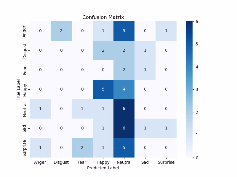 Neutralへの偏りが非常に多いため、Neutralを除外した6感情での精度を検証しました。